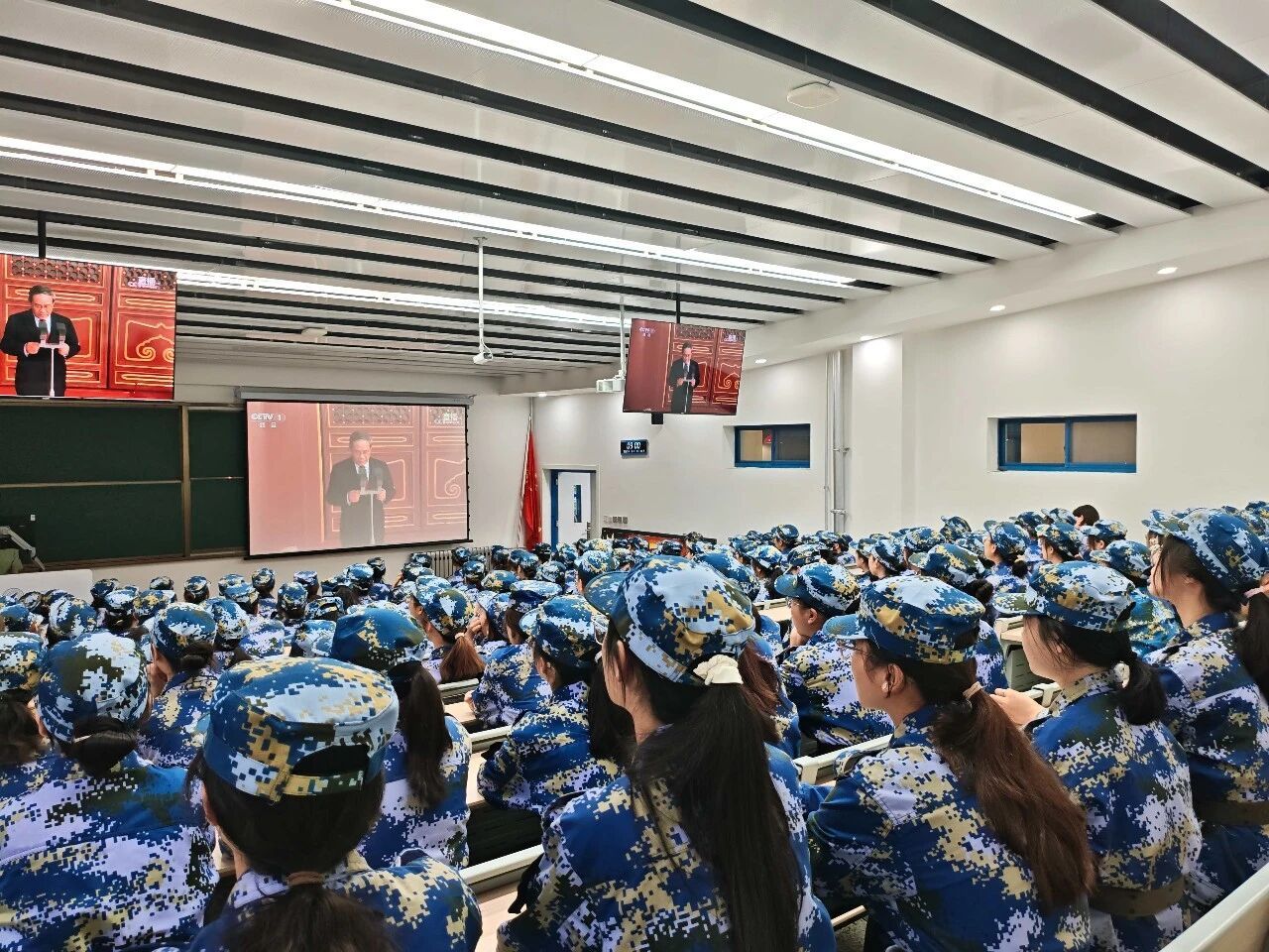 军训连队学生集中收看
