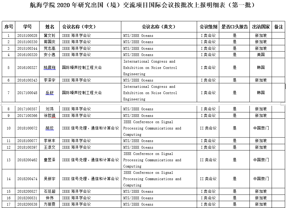 现公布Av 2020年研究生出国(境)交流项目国际会议按批次上报明细表(第一批)受资助学生名单。公示期2020年5月16日-2020年5月23日。