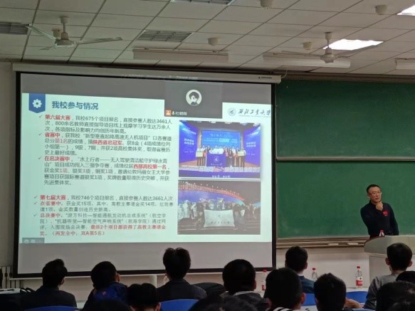 创新创业大赛的历史成就与总体概况,并鼓励学生积极参与其中。他谈到,从Av