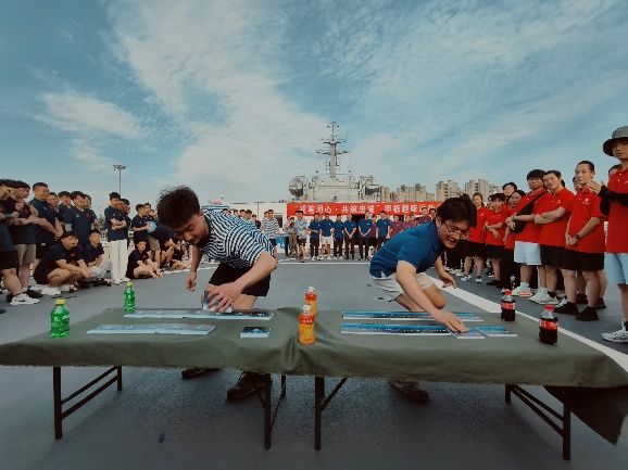 在训练舰上的生活是本次暑期社会实践的亮点之一,也成为了同学们心中最难以忘怀的回忆。从观摩官兵值更值守,到走进炊事班参与备菜劳作;从亲历舰船破浪航行的壮阔,到见证港口渐趋清晰的激动;从初包包子时的手忙脚乱,到甲板运动会上的热血呐喊。朝夕相处间,同学们不仅与海军官兵结下深厚情谊,更收获了一段珍贵的回忆。在本次暑期社会实践的最后一天,一场 “献礼建军节,青春向深蓝” 联欢晚会在舰上温情上演。全体师生与官兵齐聚一堂,来自各地的同学们各展所长,悠扬歌声、热烈掌声与阵阵欢呼交织回荡。这场充满热血与温情的晚会,为本次暑期社会实践画上了圆满句号。