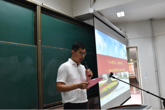 建设成就的短视频。见面会暨赠书仪式第一项,全体师生起立齐唱国歌,整个会场气氛庄严肃穆,歌声嘹亮,气势磅礴。第二项,潘光院长发表了热情洋溢的欢迎词。他代表学院党委、机关及全体教职工,向2019级研究生新生的到来表示热烈欢迎,并向同学们介绍了学院的基本情况,回顾了近年来学院在学科建设、教学科研、人才培养、创新创业、对外合作等方面取得的成绩,并引用现代诗句作为结束语与同学们共勉——“未来,就是你站在茫茫大海的这一边,遥望着海的那一边,充满好奇心,憧憬这对海那边的向往,正是对未知的不了解与向往,所以才有了去追逐未来的勇气”。