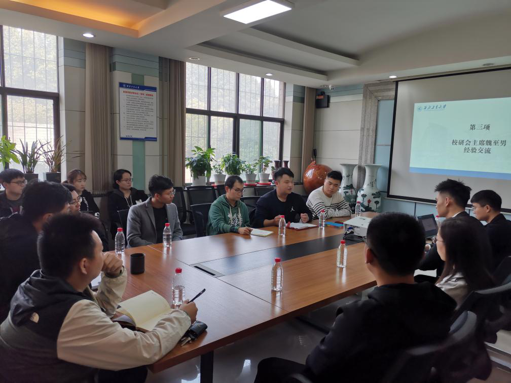 204会议室成功举行,学院院长助理张龙老师、研究生辅导员廉杰老师、校研会代表魏至男、学院研会两届主席及各部负责人近20人出席了会议,会议由李舜尧主席主持。