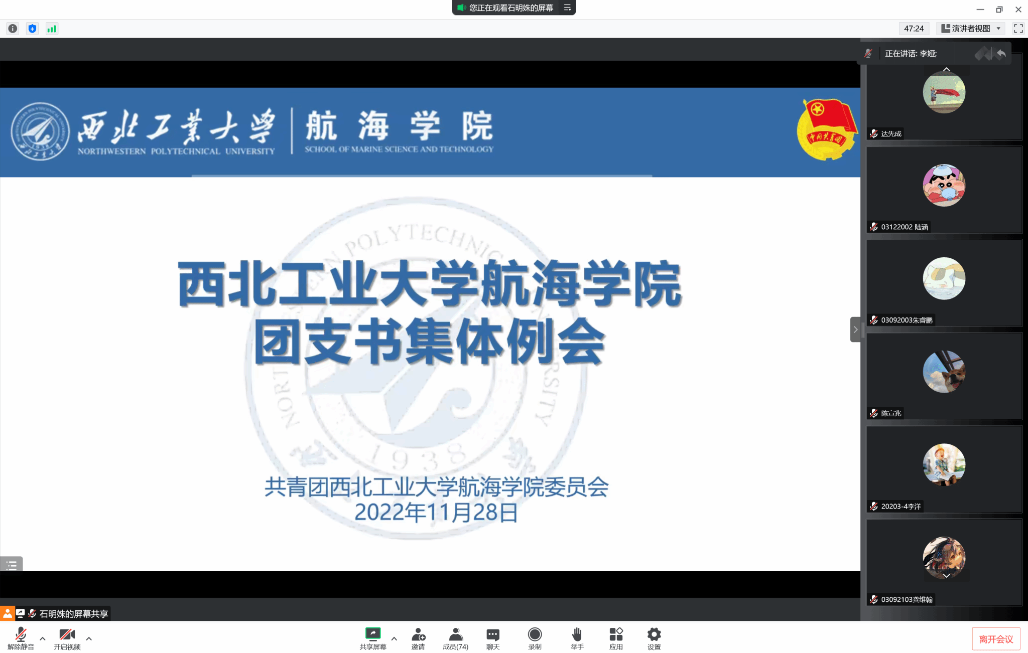 随后,李娅向各团支部书记传达了年底各项总结与近期重要工作安排。各团支部应高度重视2022年团支部“对标定级”工作,各团支部书记应仔细阅读相关工作通知与要点并认真对待年底工作述职,在相应时间节点按质按量完成各项工作。同时,鼓励共青团干部参加Av