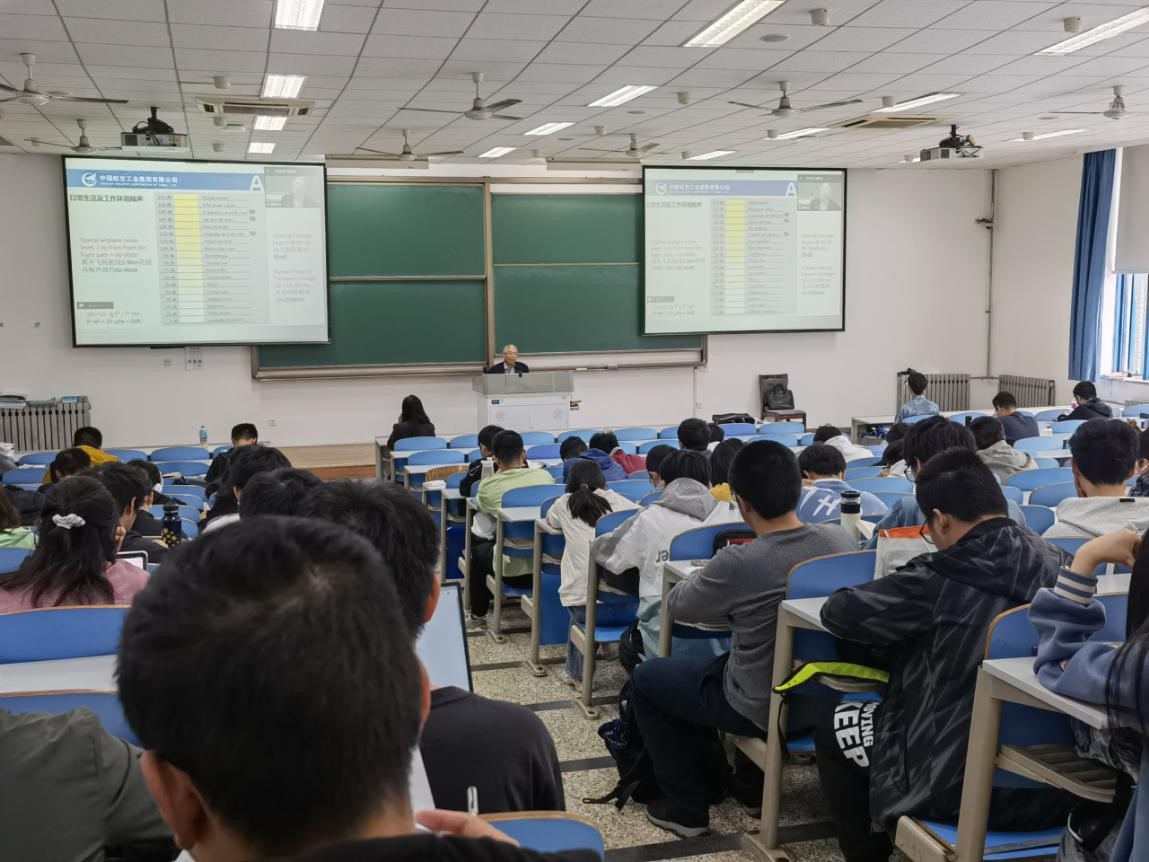 杰出校友、中国飞机强度研究所原航空声学与振动航空科技重点实验室主任黄文超研究员主讲,主题为《航空声学研究与技术需求》。海洋工程类及其他学院共330余名一年级学生到课,Av