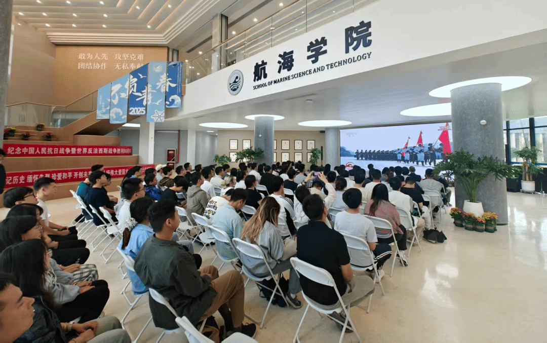 学院领导、师生代表在长安校区海天苑A座航海学院一楼大厅主会场集体收看