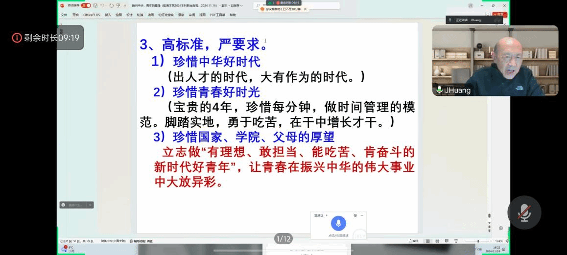近日,原西北工业大学航海学院院长、银发宣讲员黄建国教授为初入校门的大一新生们带来了一场别开生面、精彩纷呈的讲座。讲座中,黄建国老师深情回顾了前任院长黄震中教授的卓越人生与辉煌成就,并详尽阐述了航海学院的发展历程。此外,黄老师从立大志成大才、怎么学怎么干,以及高标准严要求三个方面,对新生们进行了深入而细致的劝诫与指导。他言辞恳切,寓意深远,为新生们的大学生活和未来发展指明了方向。