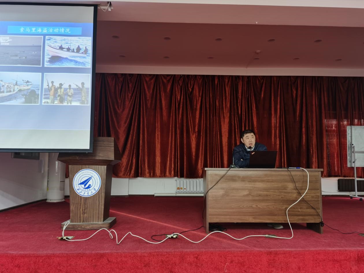 建设海洋强国,是每个“航海人”的使命与担当;海洋强国的背后又有哪些故事呢?12月3日,原徐州舰机电长,二等功臣航海学院张岩老师,以自己服役期间特殊的亚丁湾护航经历给同学们上了一节生动的党课,为同学们解读建设海洋强国的必要性和重要性。党课由张晓燕老师主持,耿云辉助理参加。