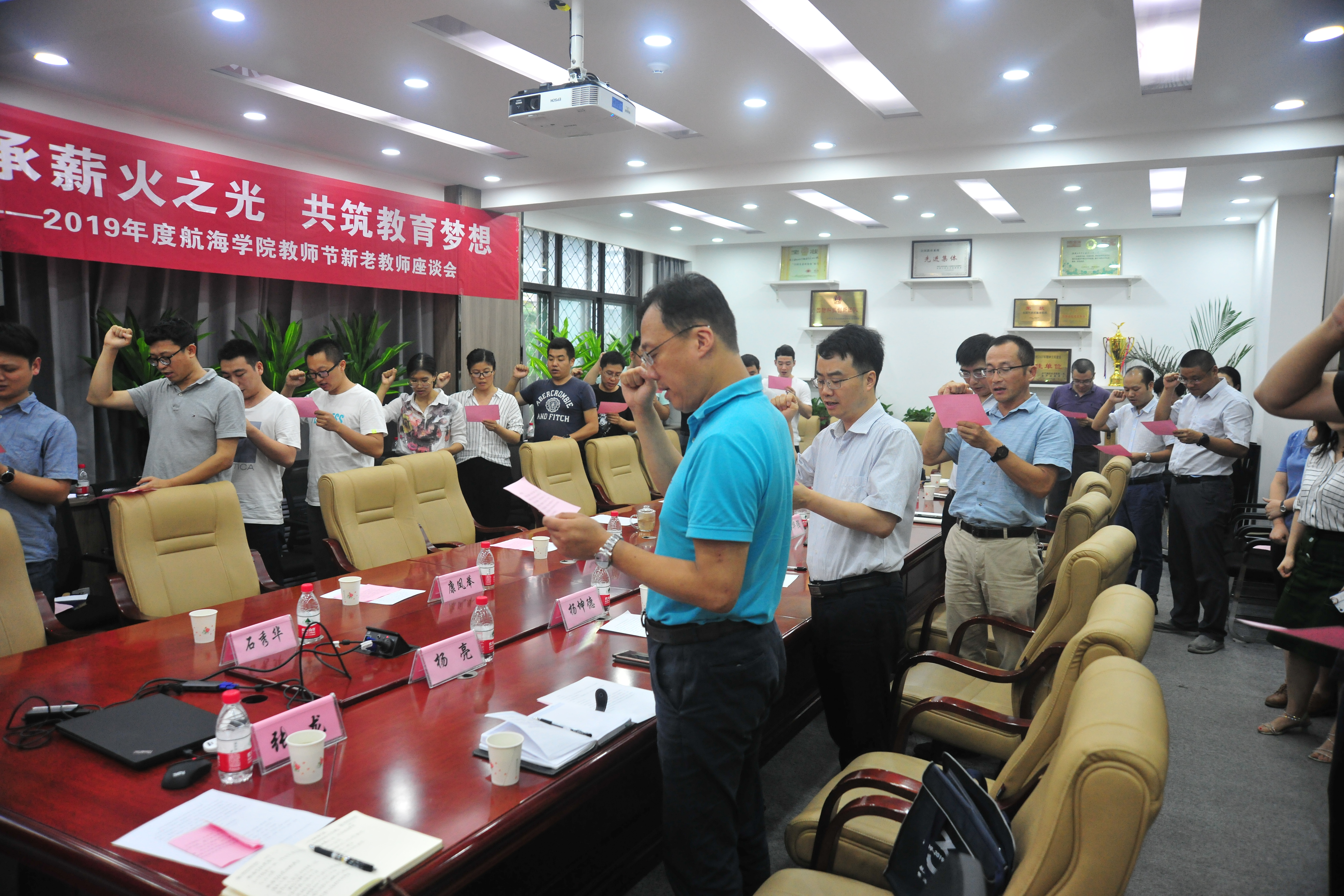 会议第七项,全体教师起立宣誓。在潘院长领誓下,青年教师们许下了自己一身的承诺,“我志愿做一名光荣的人民教师,忠诚党的教育事业,遵守教育法律法规,履行教书育人职责,坚持言传与身教相统一,引领学生健康成长,做到有理想信念、有道德情操、有扎实学识、有仁爱之心,终身为国家富强、民族振兴和教育繁荣而努力奋斗,积极为祖国和人民培养德智体美劳全面发展的社会主义建设者和接班人!”