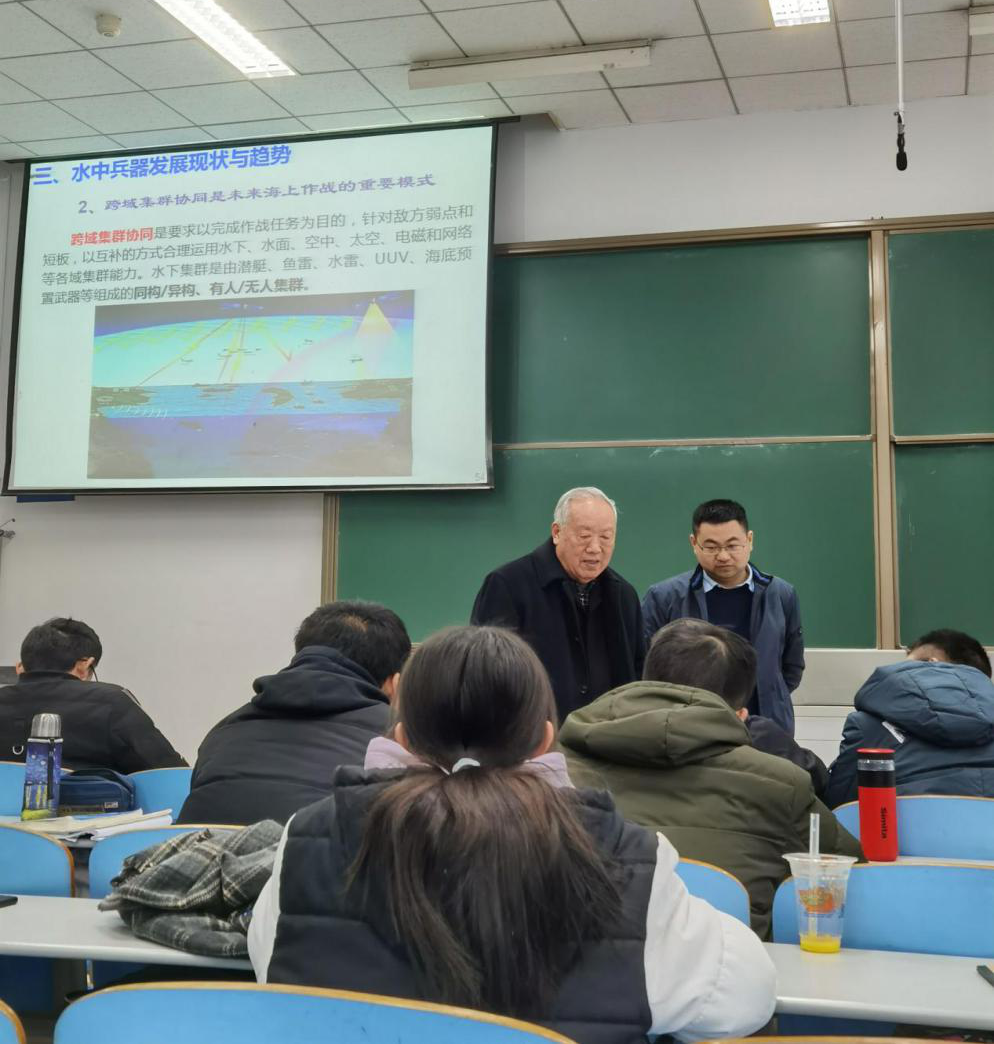 12月10日在长安校区教西D101教室,“海洋工程”大类新生研讨课《走向深蓝》系列课程由徐德民院士带来第十二讲《现代水中兵器》。徐院士从海洋强国战略、水中兵器概述、水中兵器发展现状与趋势、水中兵器涉及的科学技术问题、航海学院对水中兵器发展的贡献五方面全面介绍了现代水中兵器状况,为海院学子们带来一场学术盛筵。