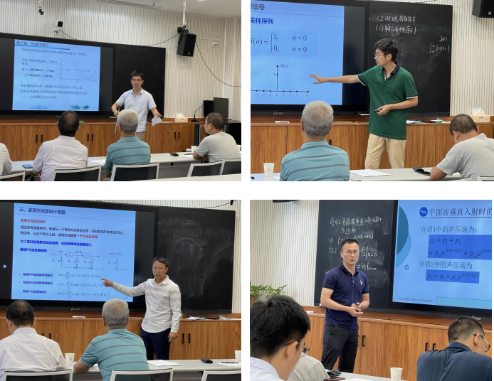 随后,四位青年教师陈铖、史阳、杨龙、周建波以PPT和板书相结合的方式试讲,依次讲述了准备参加学校试讲的微波技术、数字信号处理、水下多传感器阵列信号处理、声学基础课程中的抽选章节。