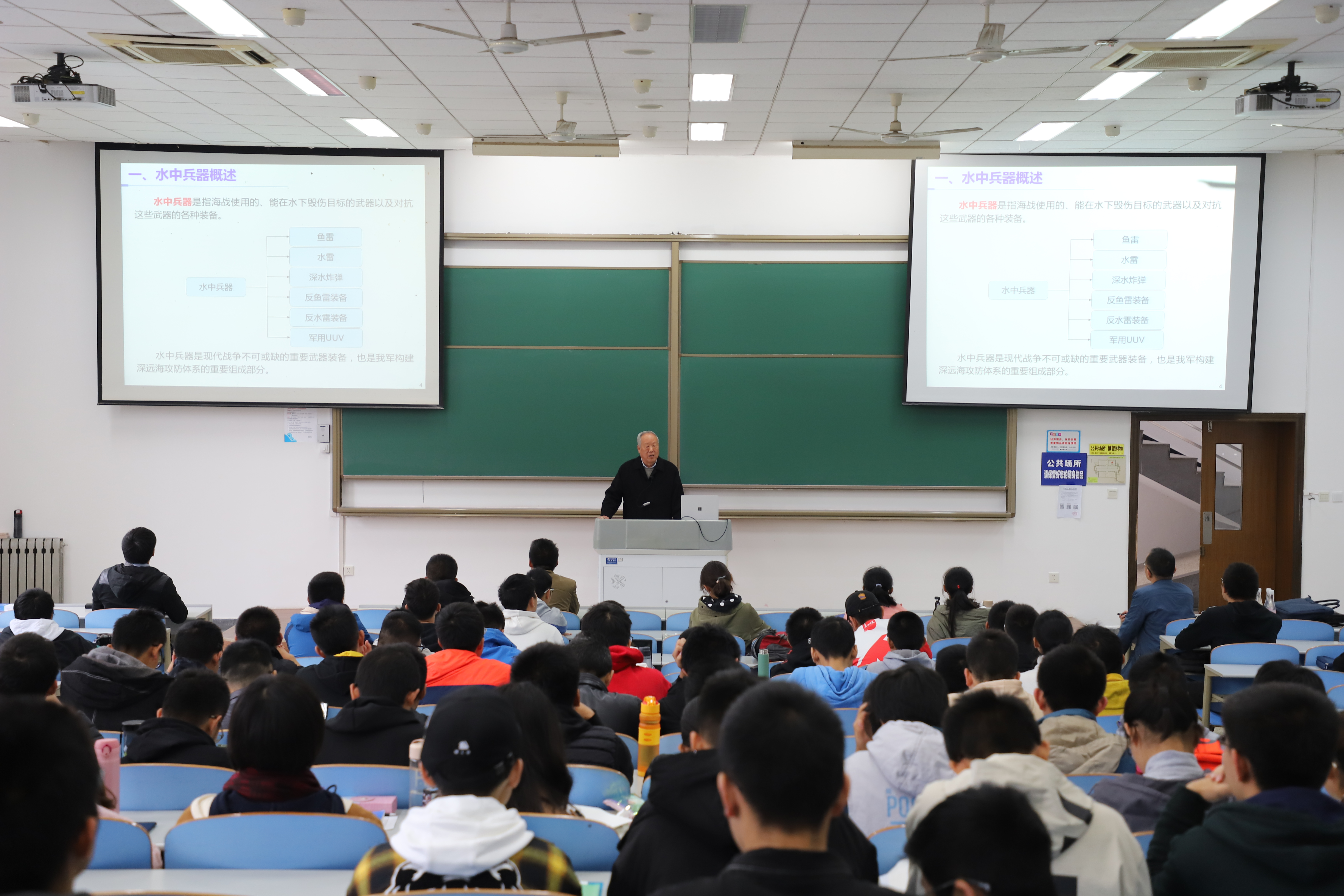 在讲到水中兵器概述时,徐德民院士向新生们介绍到“水中兵器是海上作战的主要力量,在曾经的数次大型战役中发挥着其巨大作用,是现代战争中不可或缺的重要武器装备,也是我军构建深远海攻防体系的重要组成部分”。