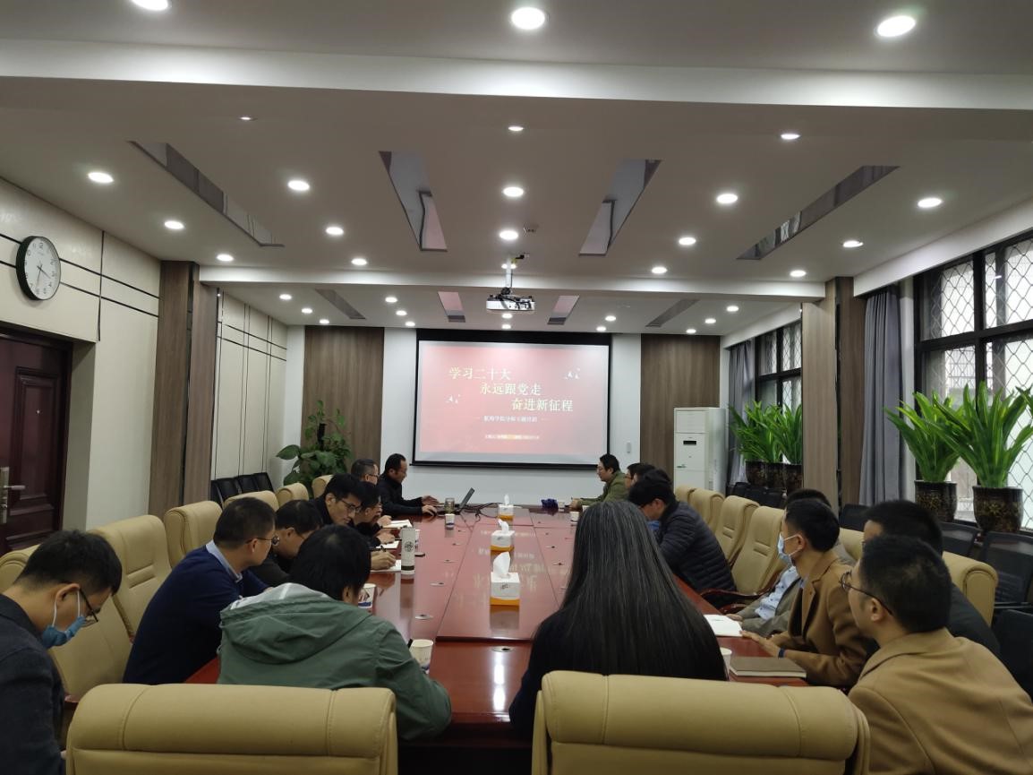 孙华强宣贯了党的二十大精神,从党的二十大简介、“数读”二十大报告、中国辉煌这十年、党的二十大领航教育、党的二十大指引科创、奋进新征程几大方面详细领学了党的二十大报告中的重点内容,并结合学院研究生教育的发展实际,重点解读了与之密切相关的内容。