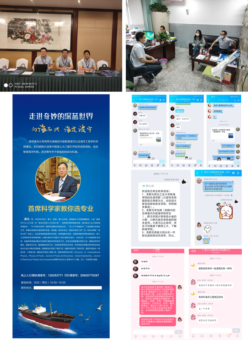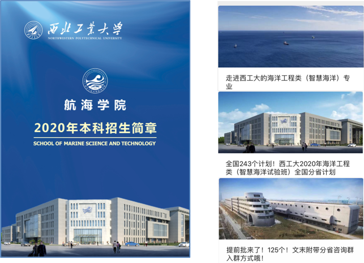 重点针对新高考改革背景下,结合航海学院大类招生实际情况,加强大类招生宣传。梳理凝练航海学院各专业方向特色,编写纸质版招生简章《航海学院2020年本科招生简章》。另外,积极发挥线上宣传的优势,在我院“海之声”公众号上推出主题为“走进西工大的海洋工程类(智慧海洋)专业”、“全国243个计划!西工大2020年海洋工程类(智慧海洋试验班)分省计划”、“提前批来了!125个!文末附带分省咨询群入群方式哦!”三个线上微信推送等。